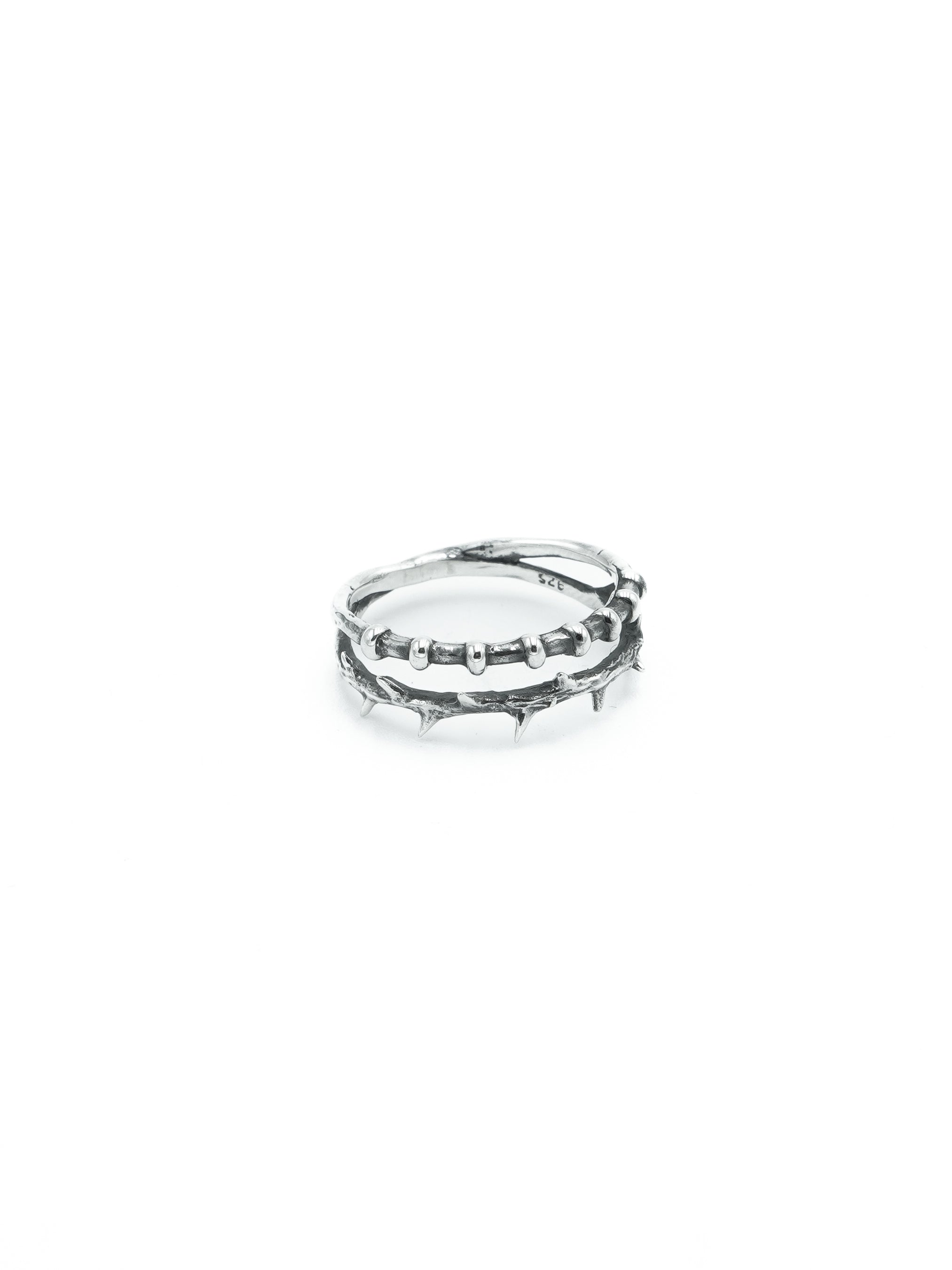 Maison Geneviève imagine des bijoux aux inspirations martiales avec une touche d’impudence. Cette bague, façonnée à la main en argent 925, représente une ronce entremêlées avec un tube industriel, un mélange de nature brute et d'industrialisation.