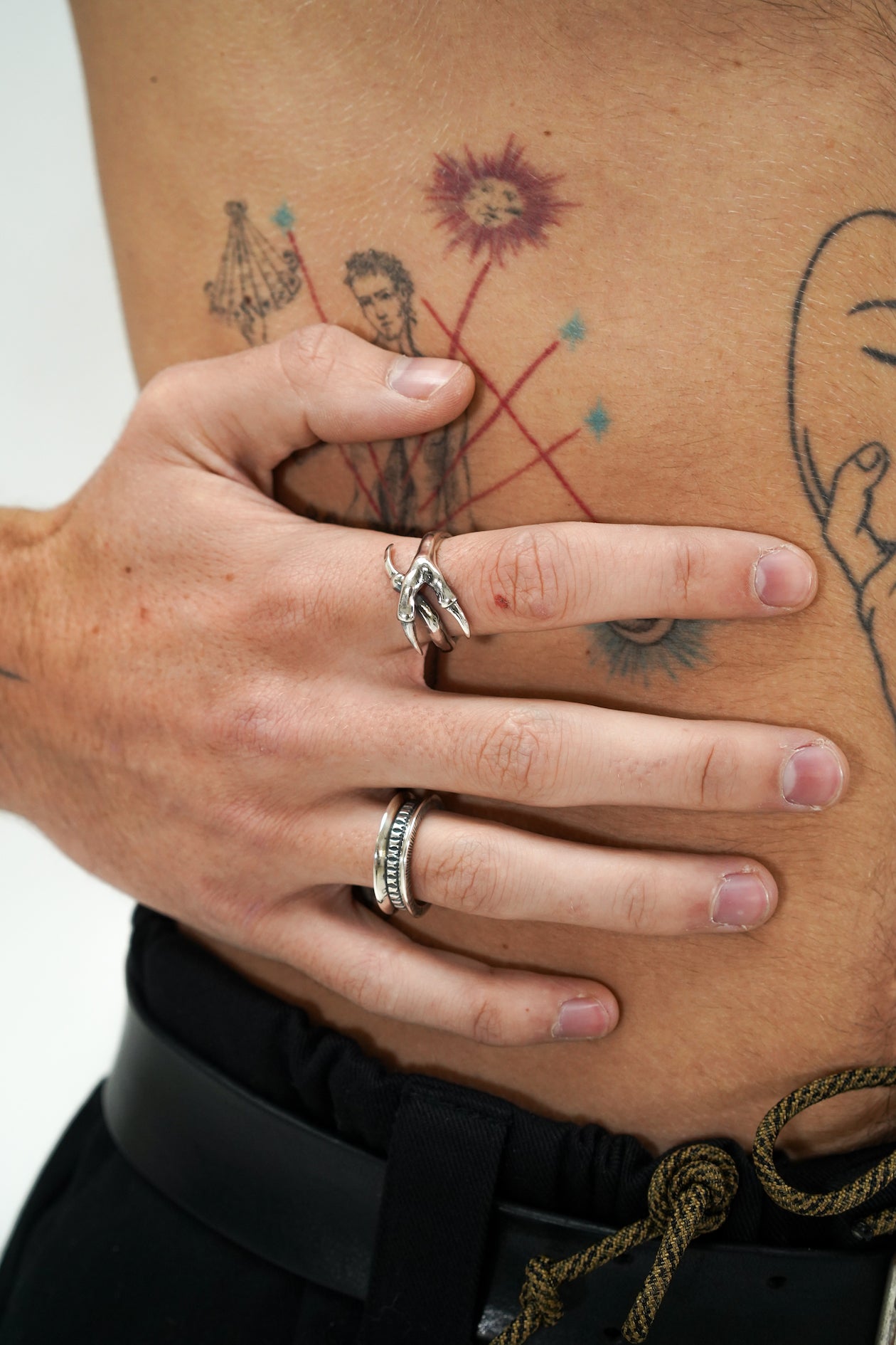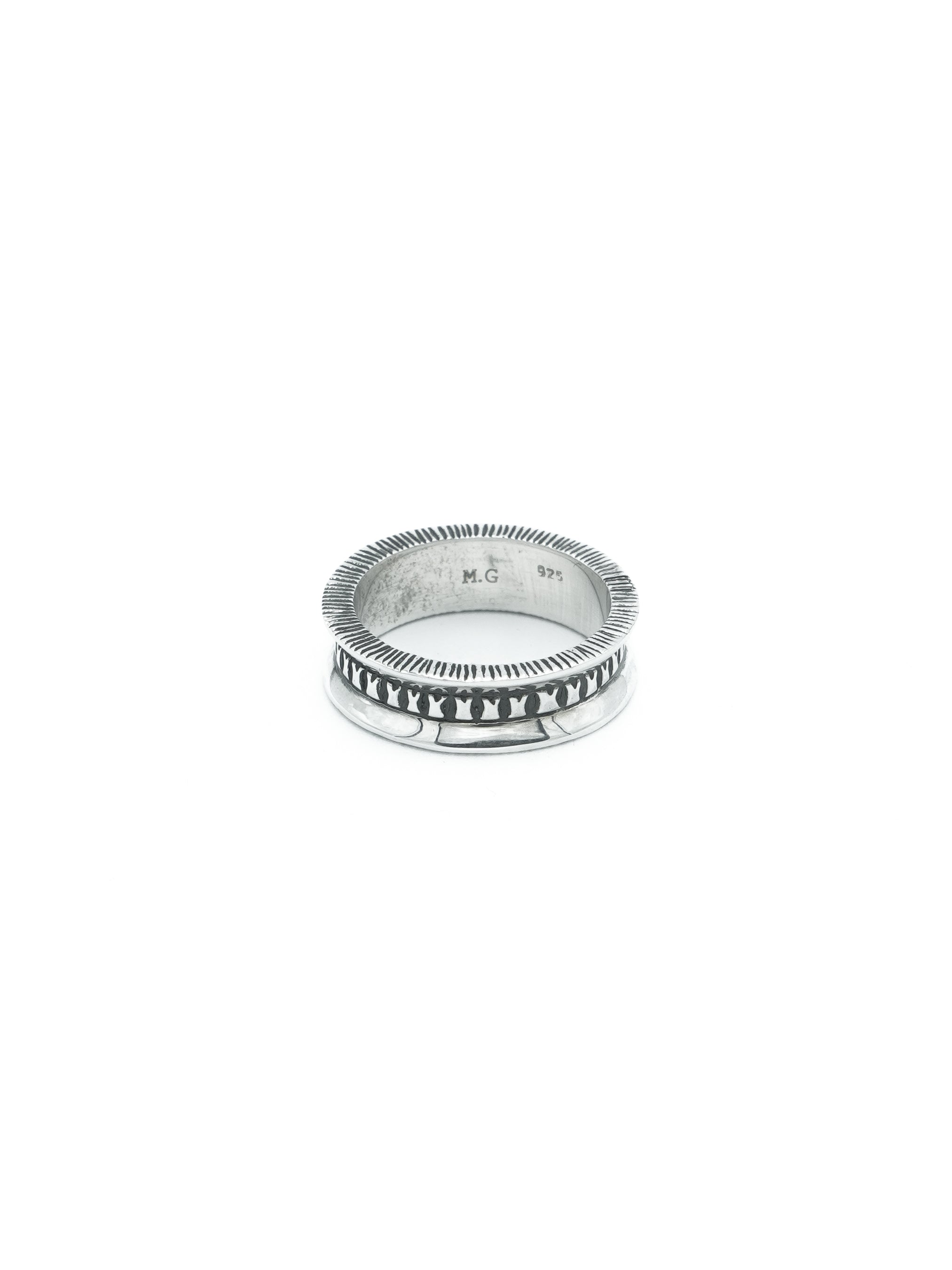Maison Geneviève imagine des bijoux aux inspirations martiales avec une touche d’impudence. Cette bague, façonnée à la main en argent 925, représente une forme de jante avec une partie creuse au centre et des coupures sur les parties extérieures réalisées à la main.