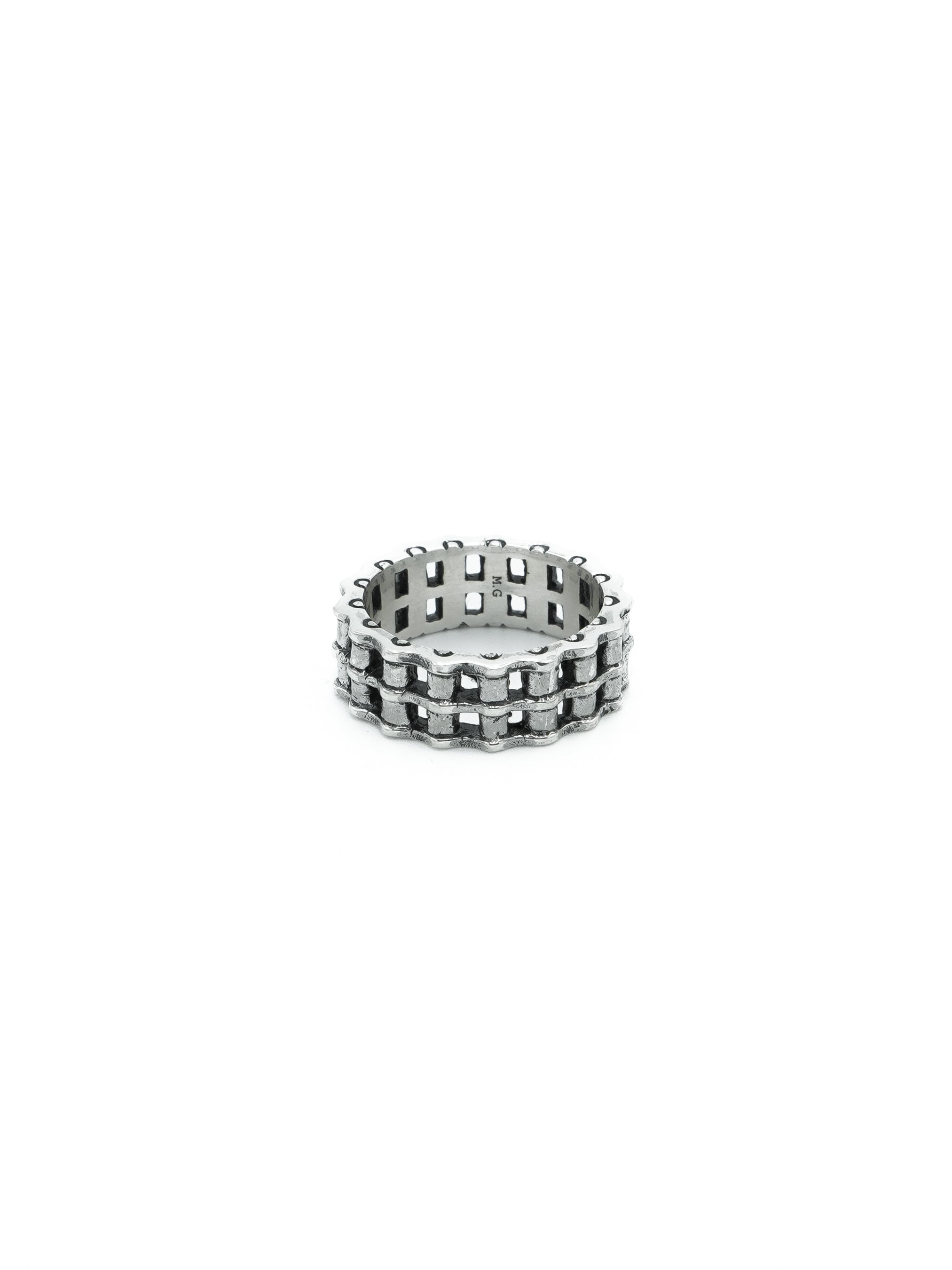 Cette bague, façonnée à la main en argent 925, représente une double chaine de transmissions mécanique.