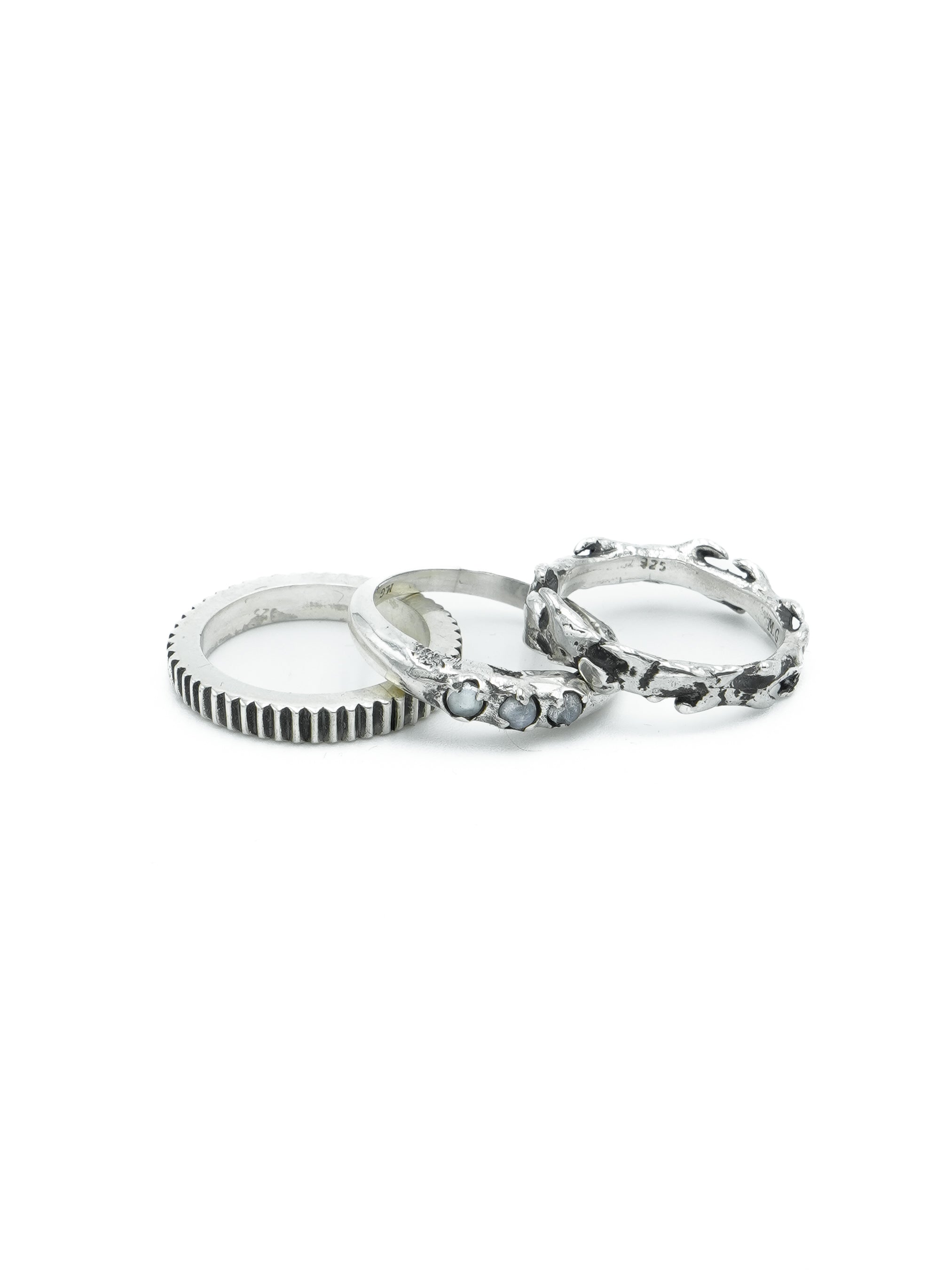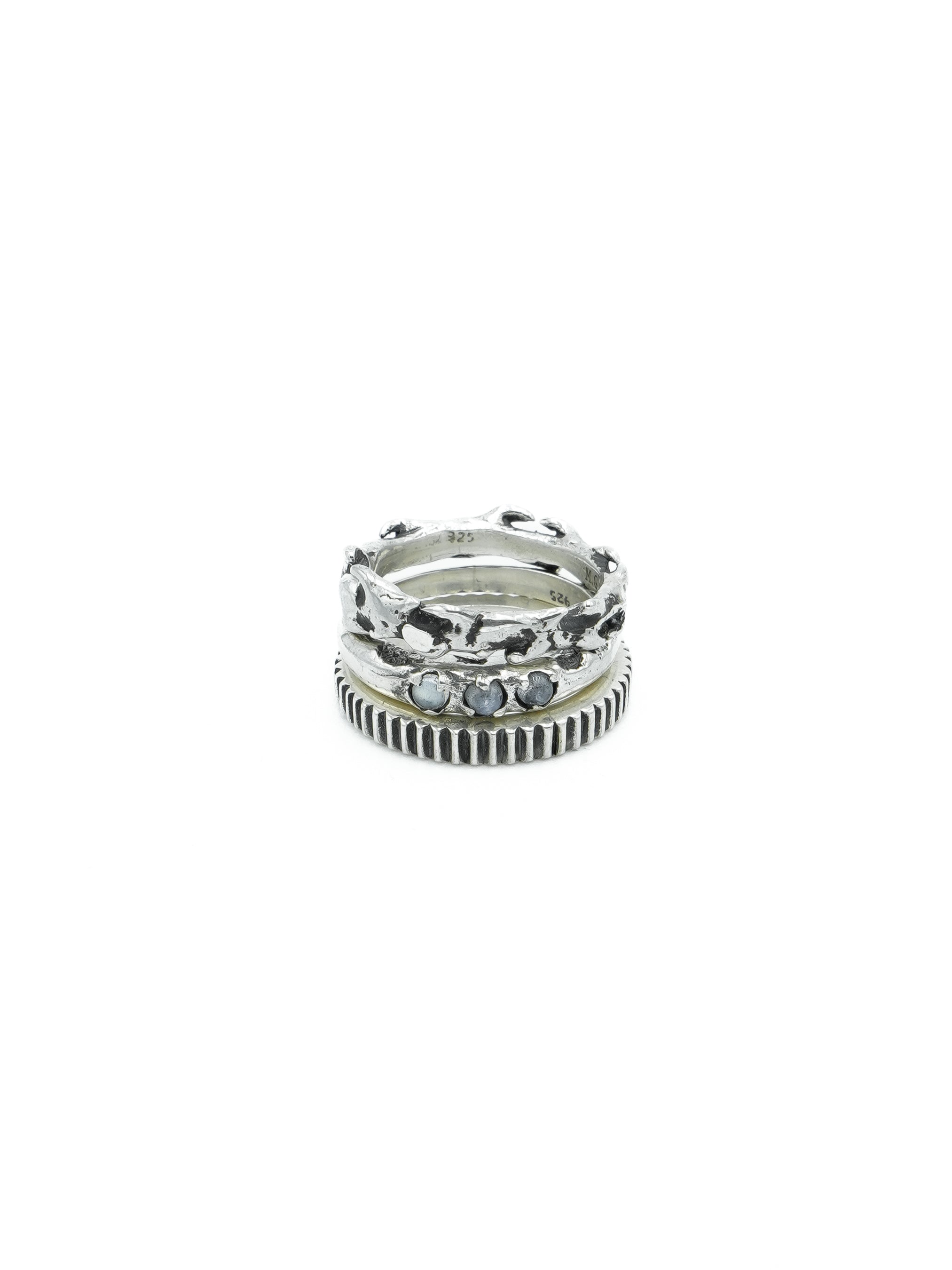 Ces bagues, façonnée à la main en argent 925, en trio représentent un esprit industriel grâce à un engrenage mécanique, une touche organique avec des pierres brutes, la beauté pure et mystérieuse de la nature avec trois pierres de lune, le tout dans un style simple et brut.
