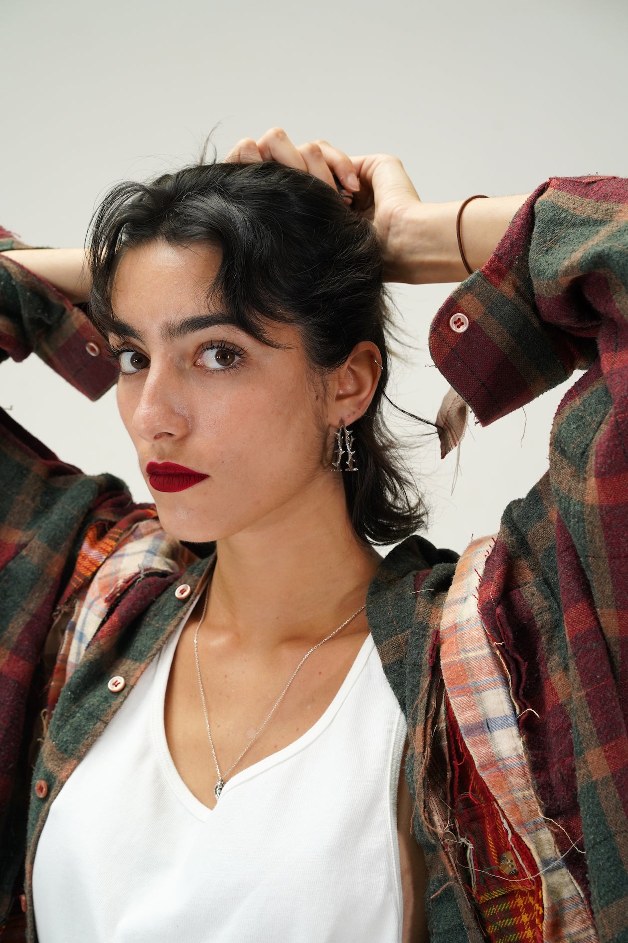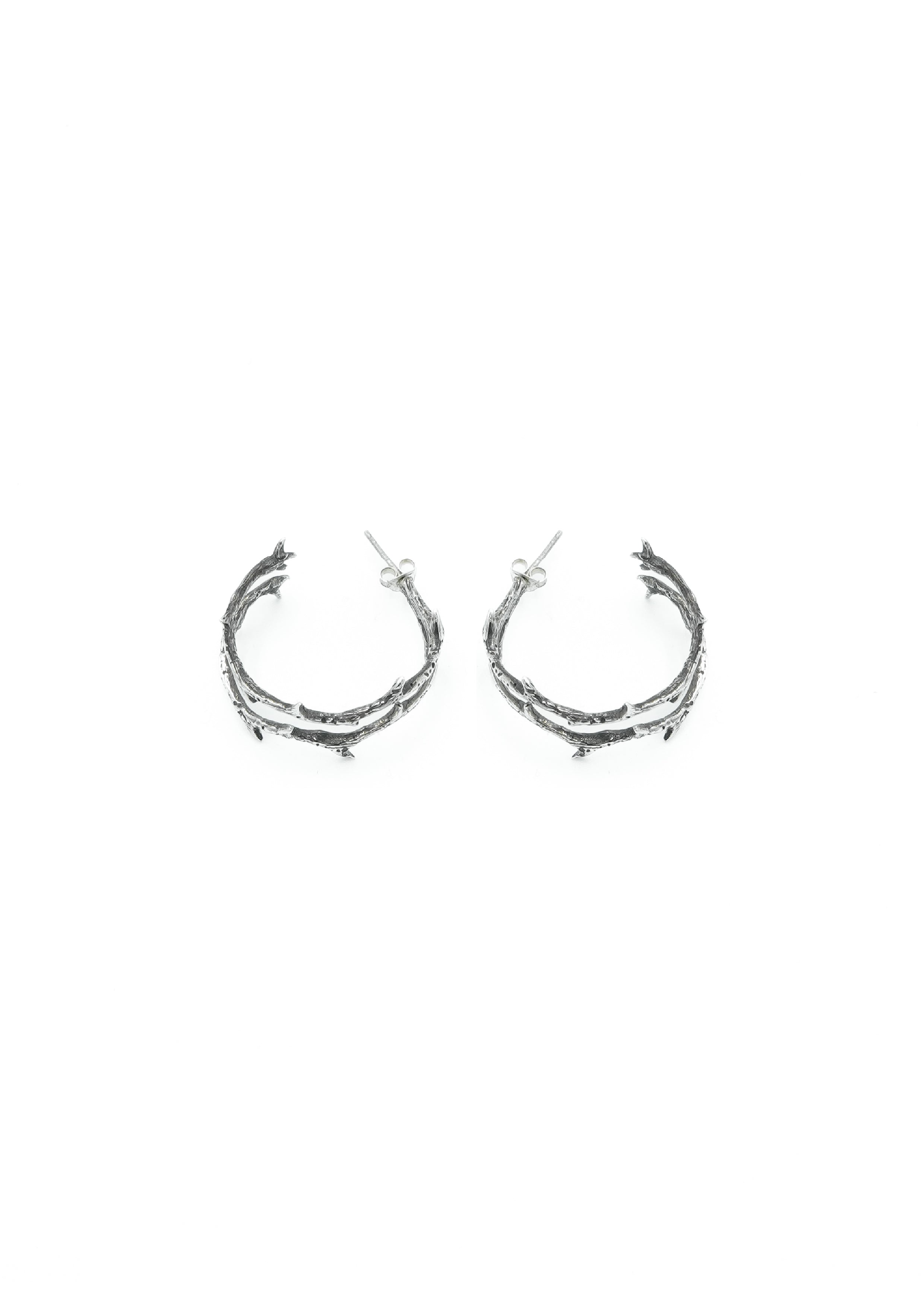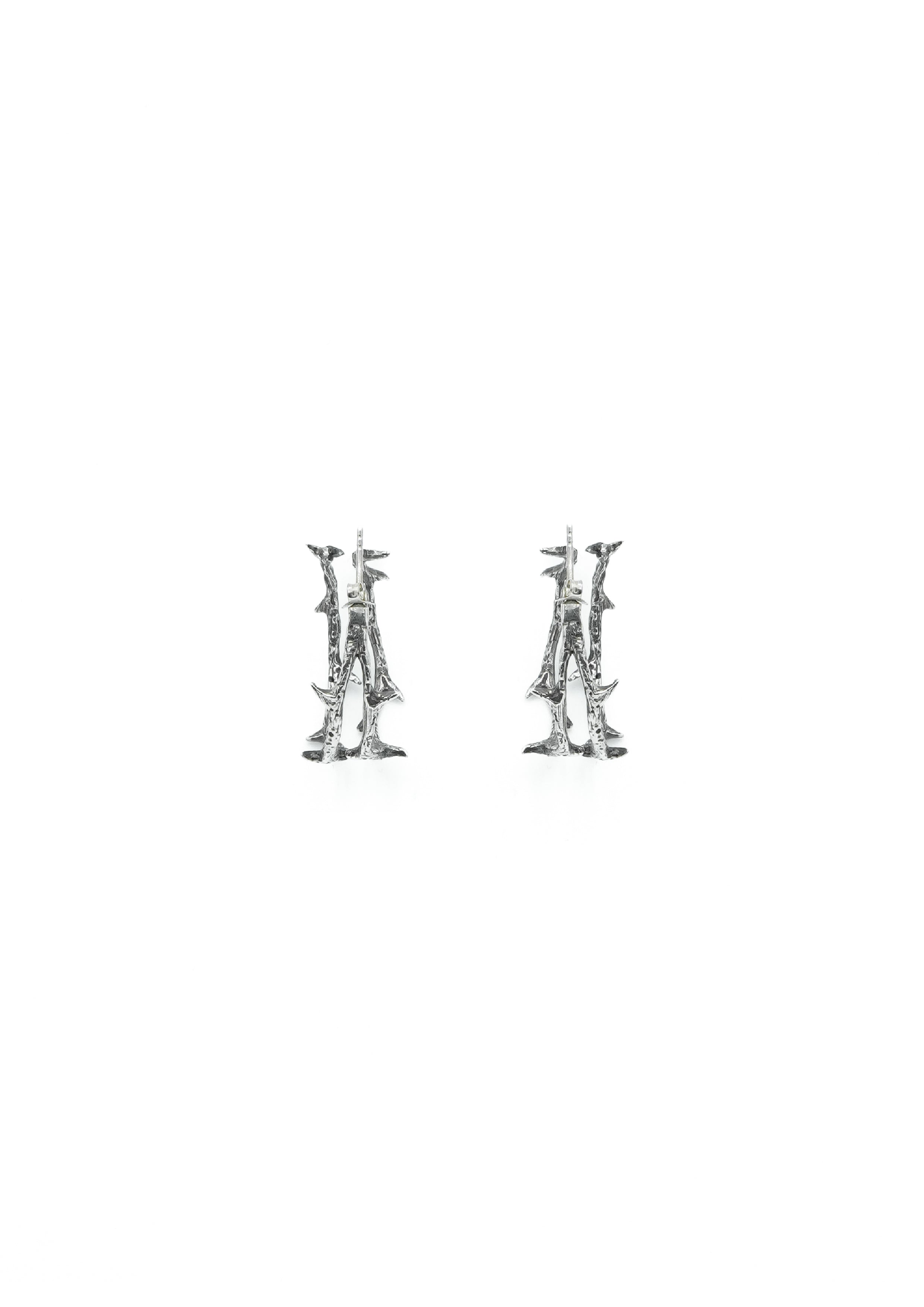 Maison Geneviève imagine des bijoux aux inspirations martiales avec une touche d’impudence. Cette paire de boucles d’oreilles, façonnée à la main en argent 925, représente des branches de ronce. Chaque boucles est constituée de deux anneaux parsemés de piques. Elles dévoilent une relation bipolaire alliant l’esprit sauvage à celui de la claustration.