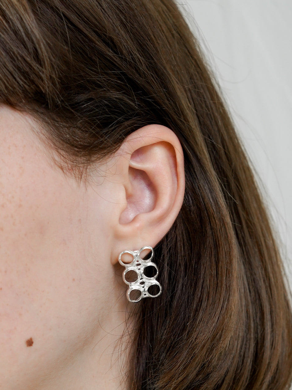 Maison Geneviève imagine des bijoux aux inspirations martiales avec une touche d’impudence. Cette paire de boucles d’oreilles, façonnée à la main en argent 925, représente par l’assemblage de cercles (6 pack beer) l’emballage plastique des packs de bières. Cette paire vogue sur une atmosphère plus légère rappelant des moments de désinvolture.