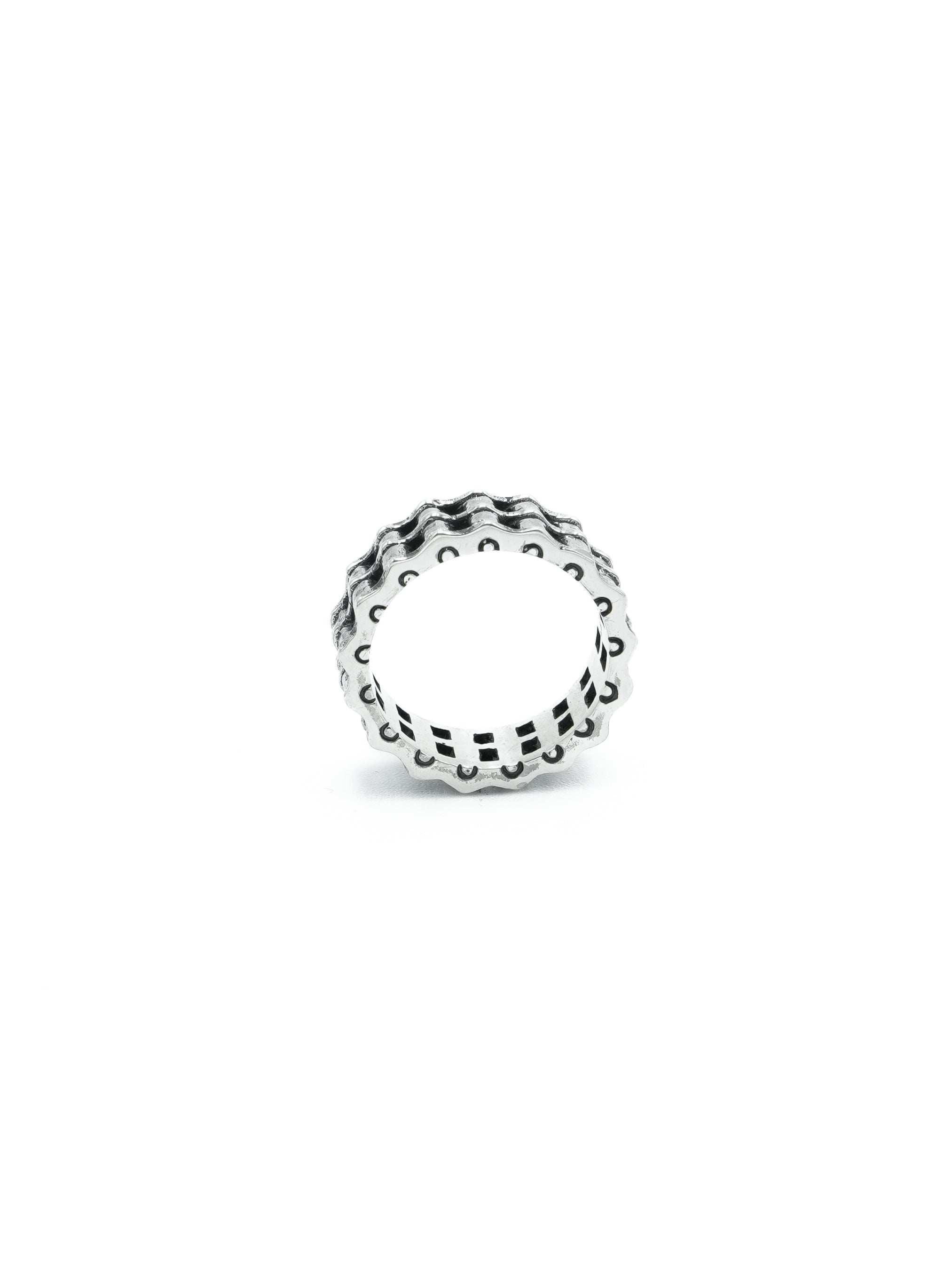 Cette bague, façonnée à la main en argent 925, représente une double chaine de transmissions mécanique.