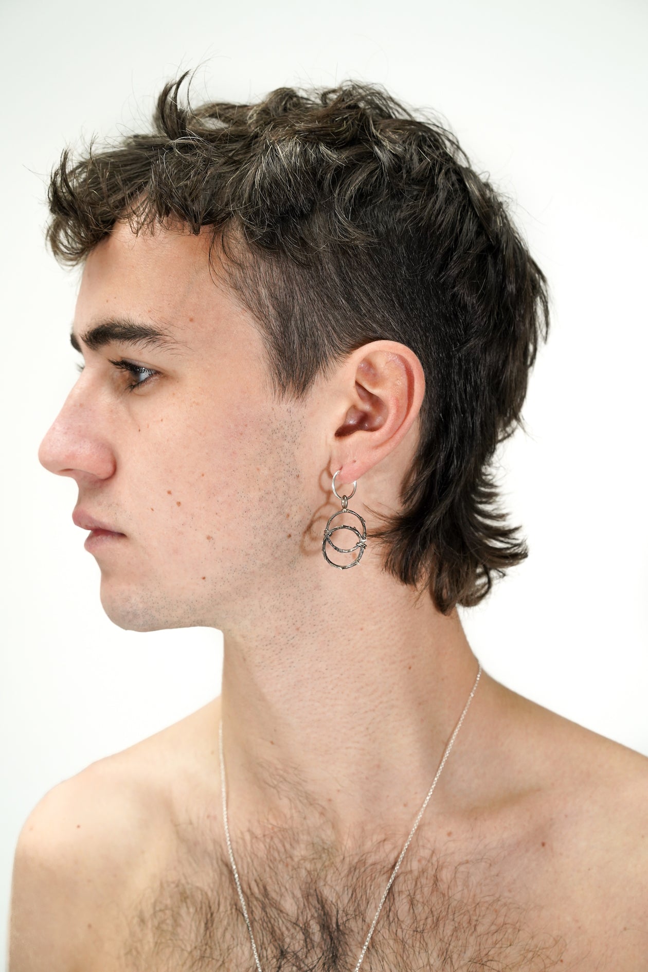 Maison Geneviève imagine des bijoux aux inspirations martiales avec une touche d’impudence. Cette boucle d’oreille, façonnée à la main en argent 925, représente une ronce entremélée avec un barbelé, un bijoux aiguisé.