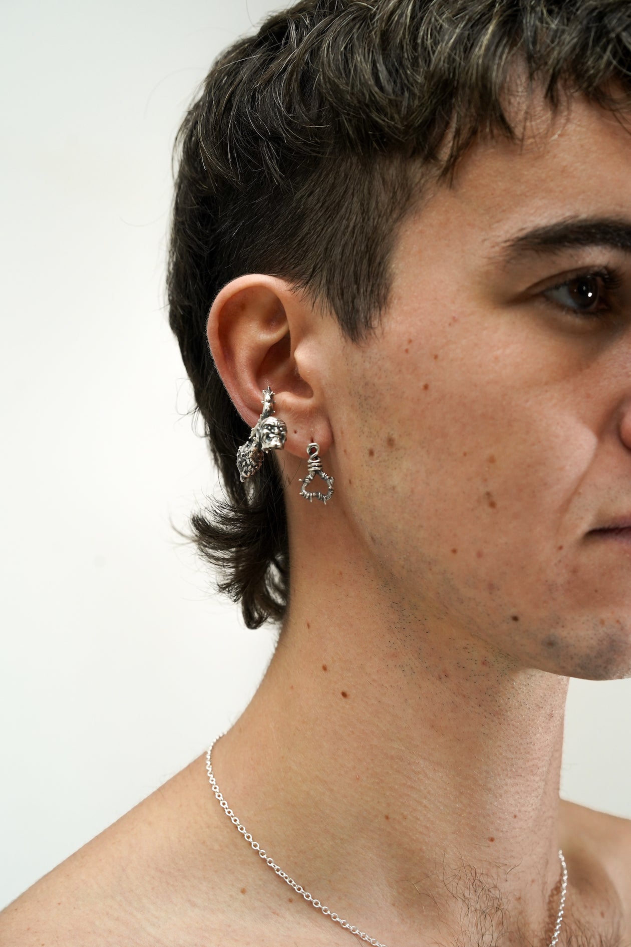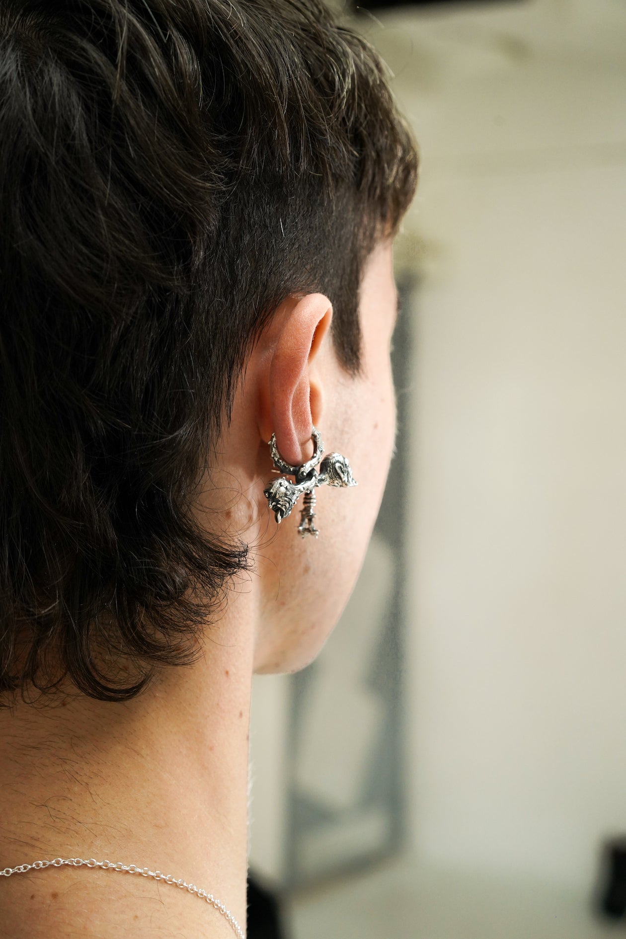 Maison Geneviève imagine des bijoux aux inspirations martiales avec une touche d’impudence. Ce earcuff, façonné à la main en argent 925, représente des corps de reptiles entremêlés, chacun avec son visage de démons japonais.
