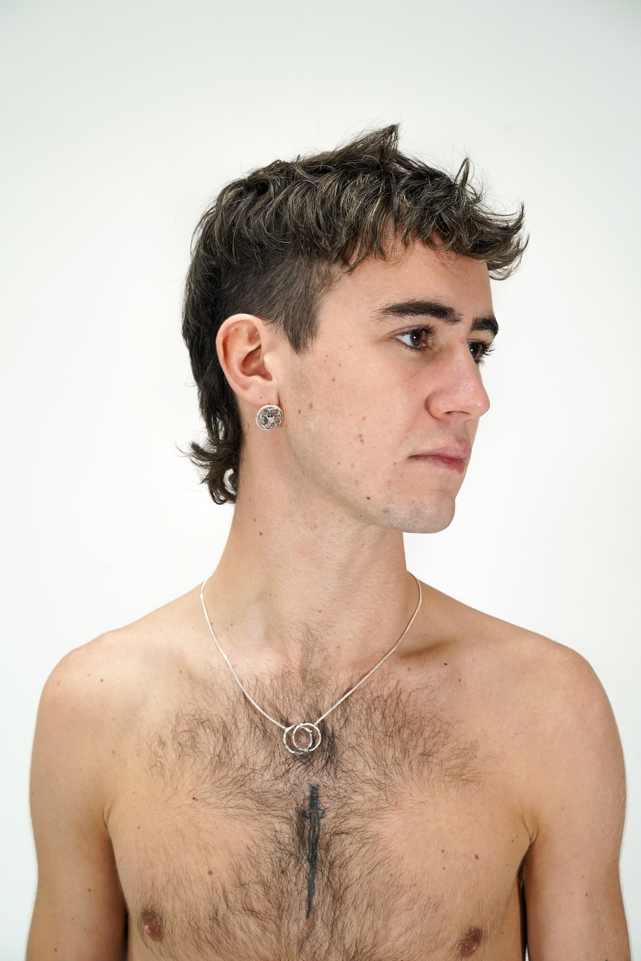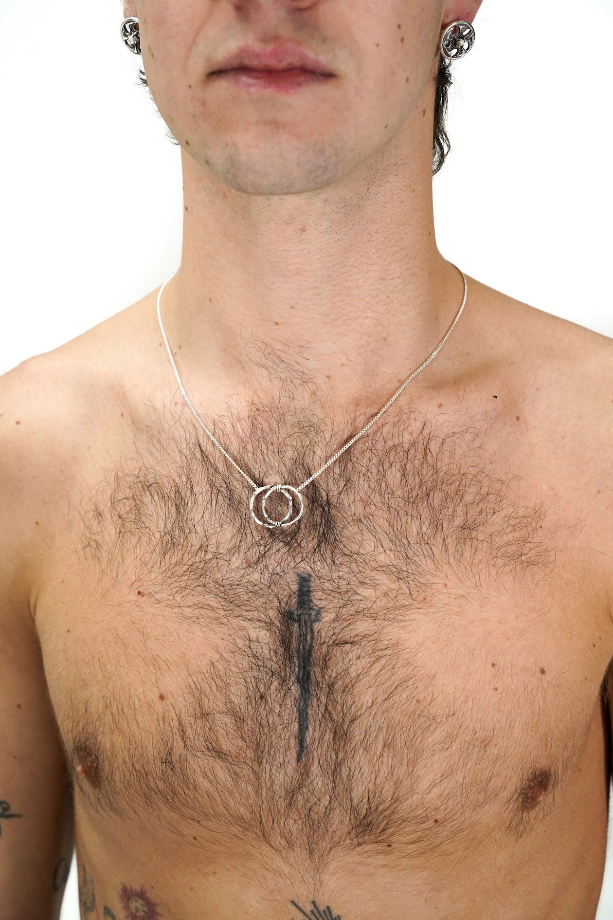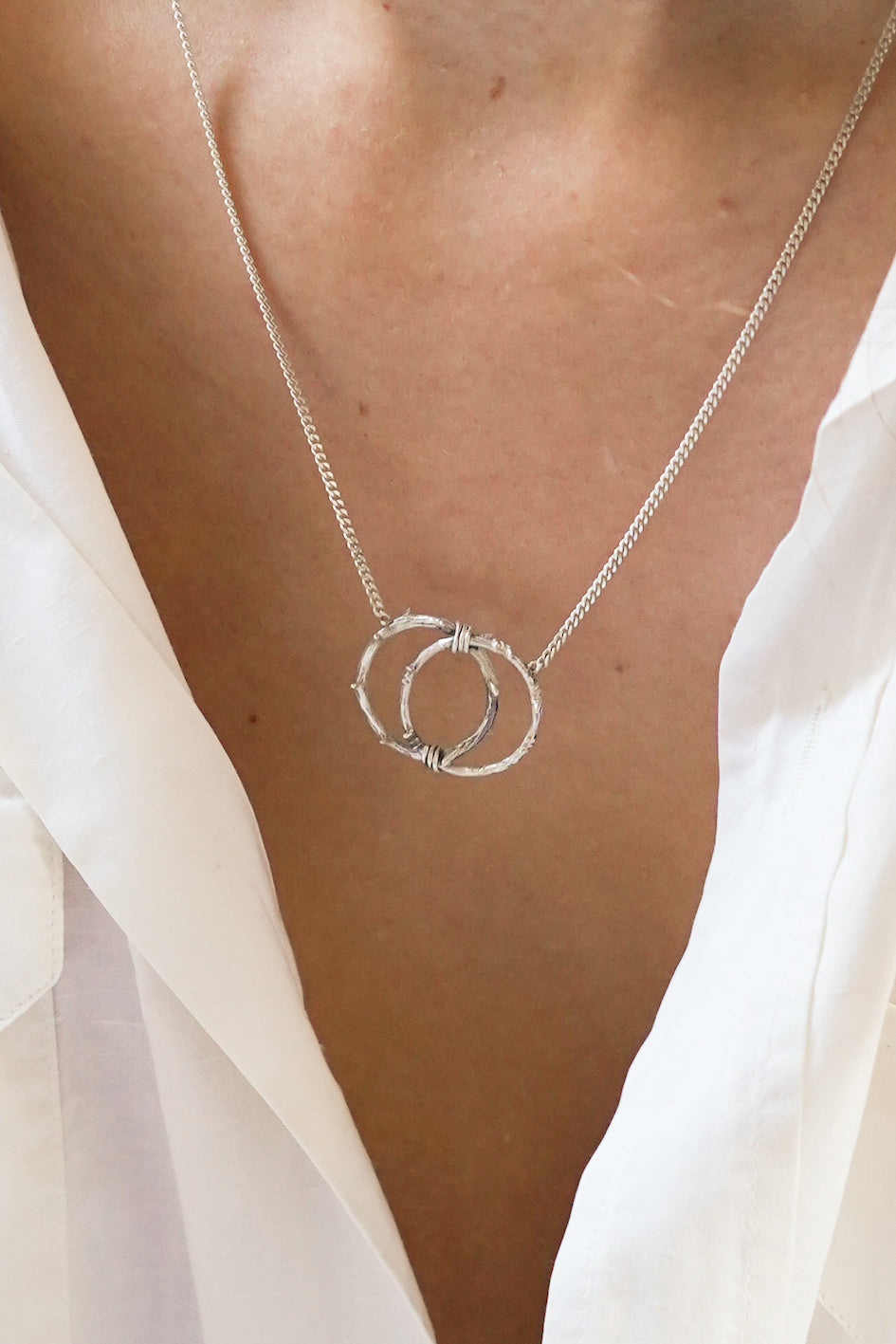 Collier en argent, anneaux de ronce entremêlées avec un barbelé, sautoir mi-long, unisexe.