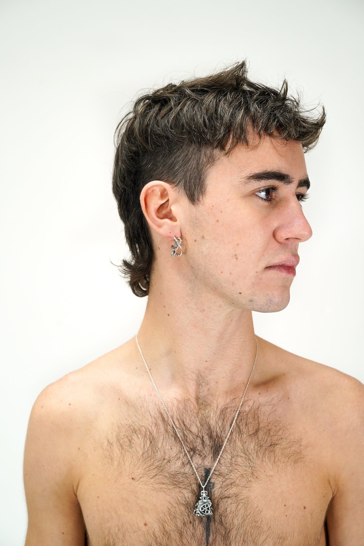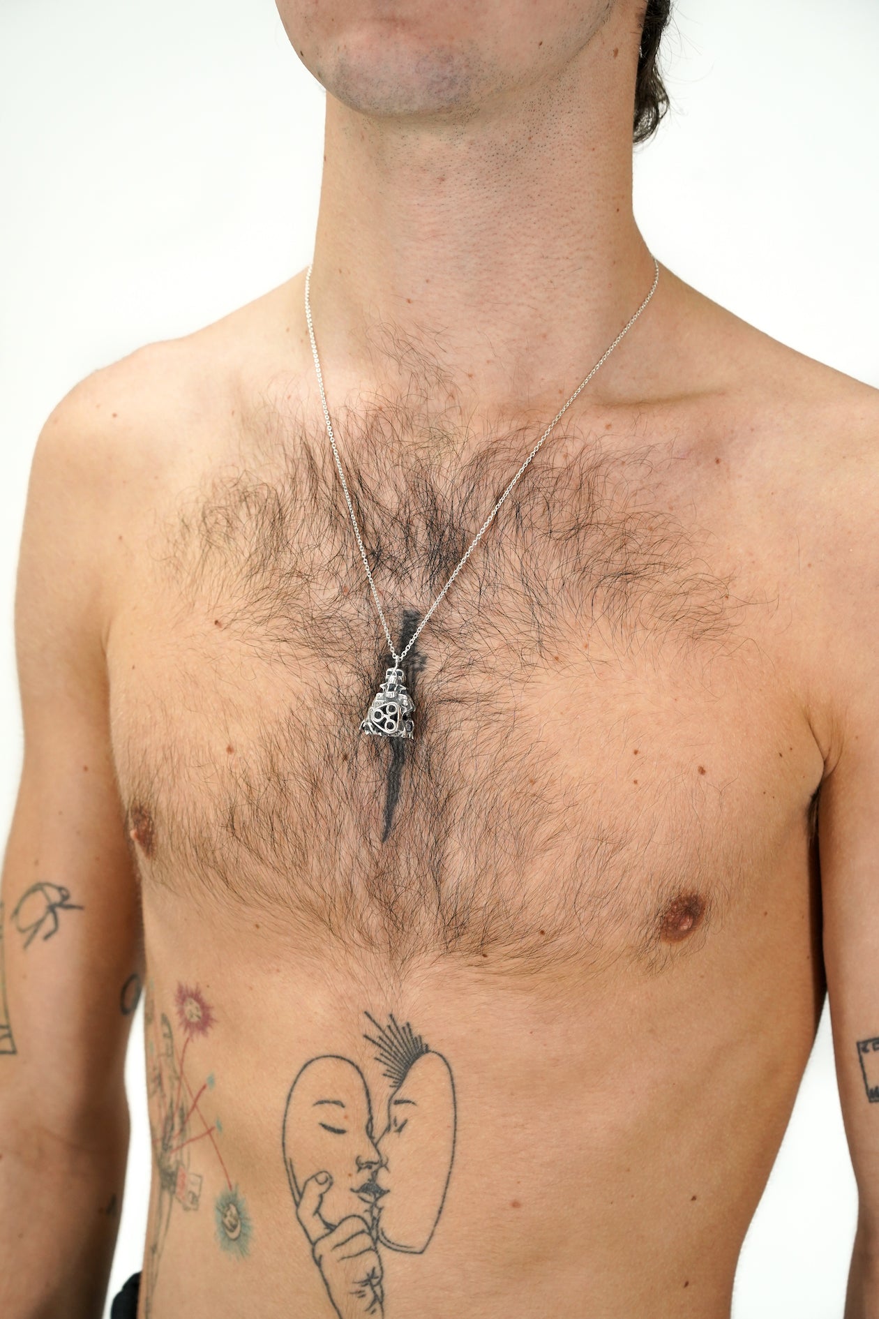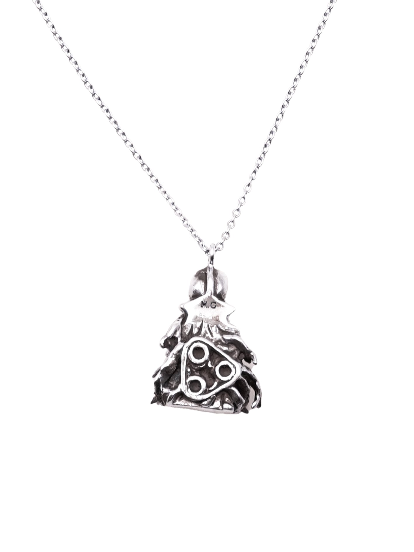 Maison Geneviève imagine des bijoux aux inspirations martiales avec une touche d’impudence. Ce pendentif, façonné à la main en argent 925, représente un objet industriel provenant d’un moteur de voiture avec une tête de mort soudée dessus et des racines qui commencent à s’approprier l’objet.