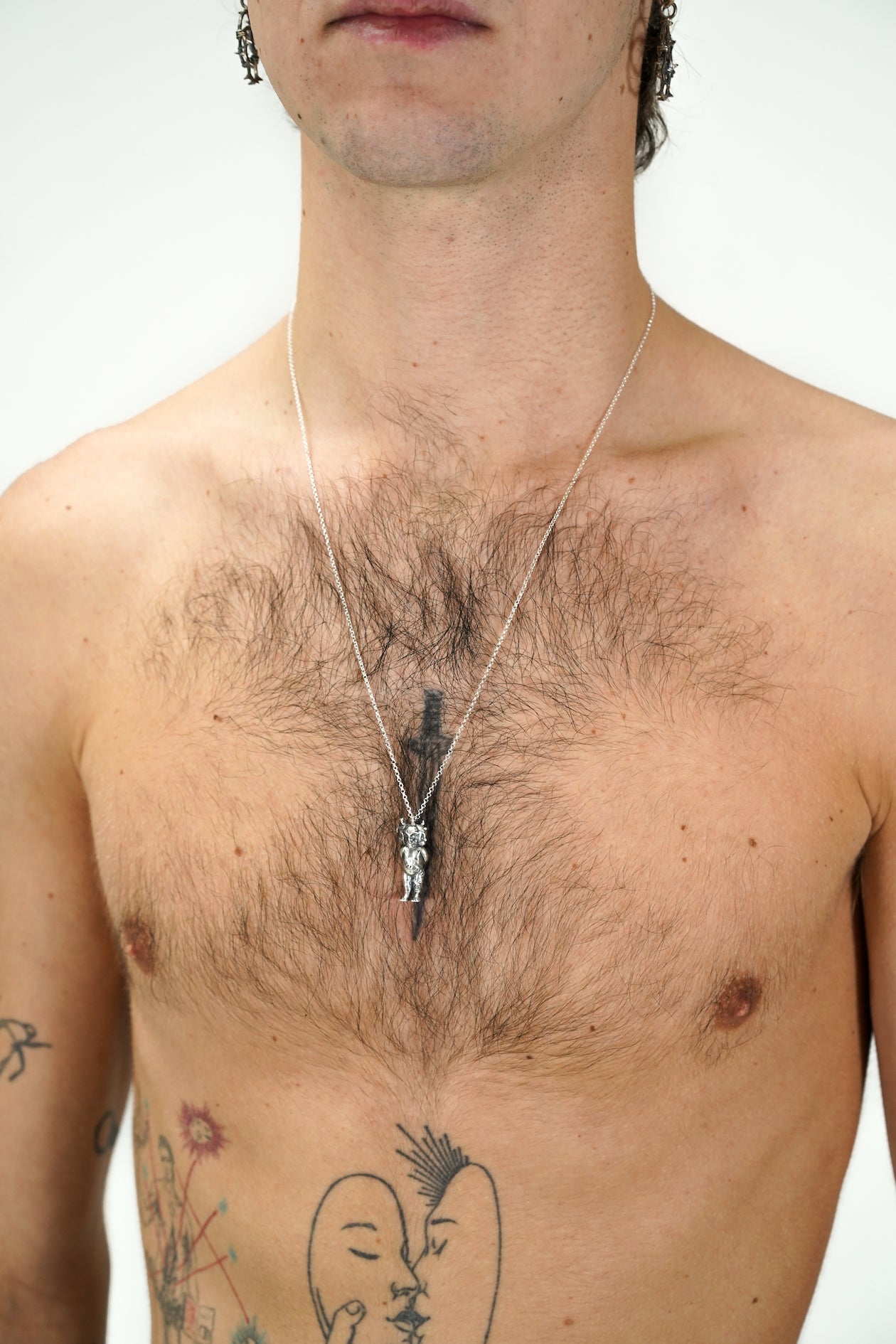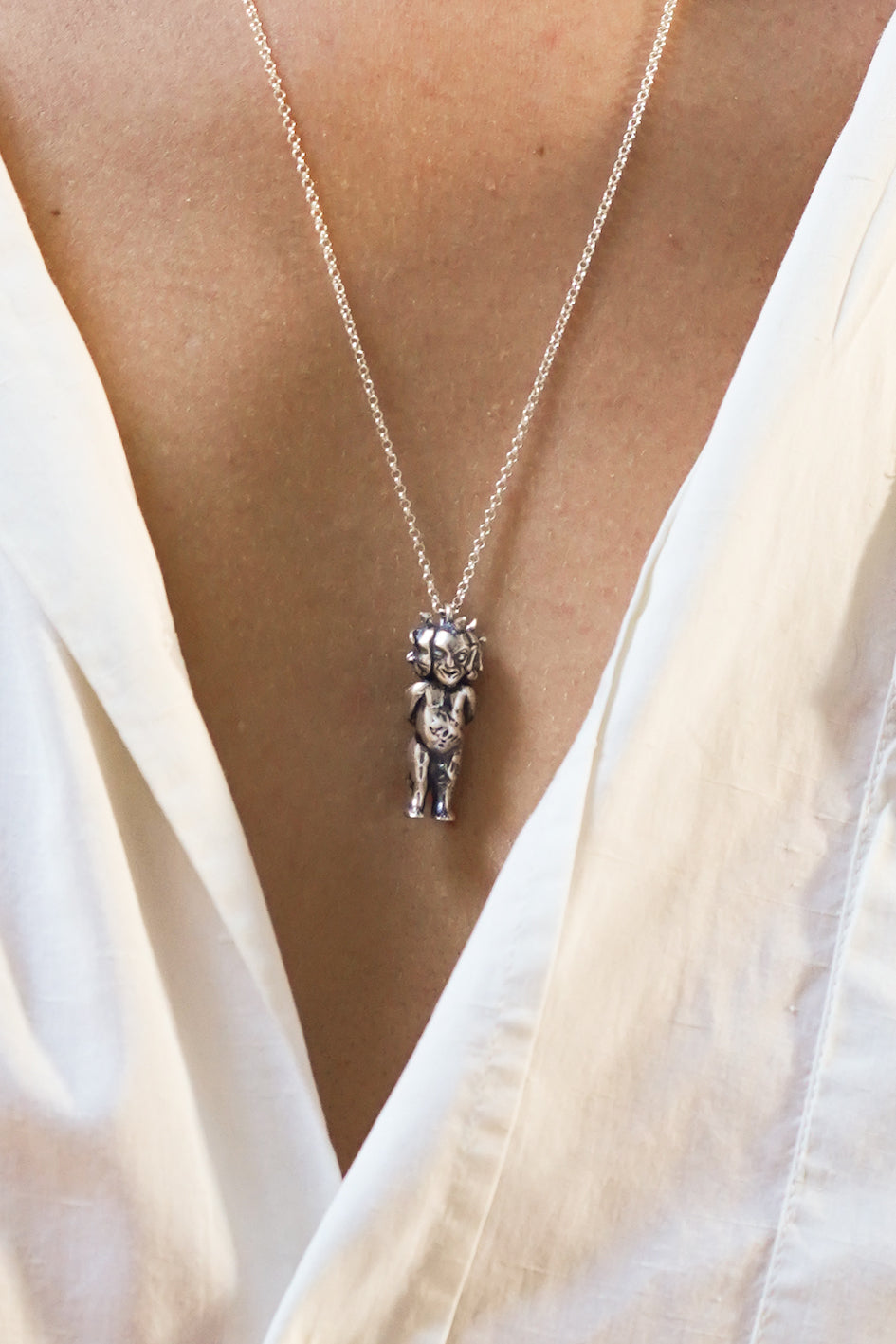 Maison Geneviève imagine des bijoux aux inspirations martiales avec une touche d’impudence. Ce pendentif, façonné à la main en argent 925, représente un enfant à trois têtes de démons, inspiré des monstres et légendes de l’histoire .