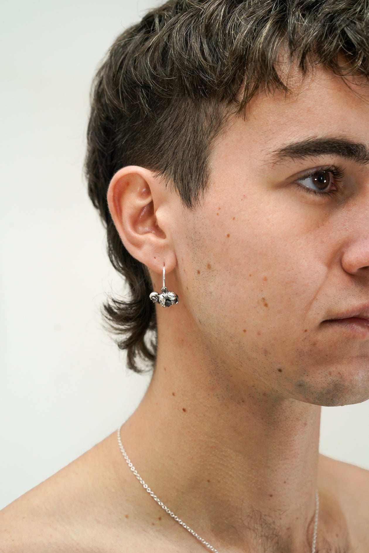Maison Geneviève imagine des bijoux aux inspirations martiales avec une touche d’impudence. Cette boucle d’oreille, façonné à la main en argent 925, représente un démon japonais qui emprisonne un diamant brut.