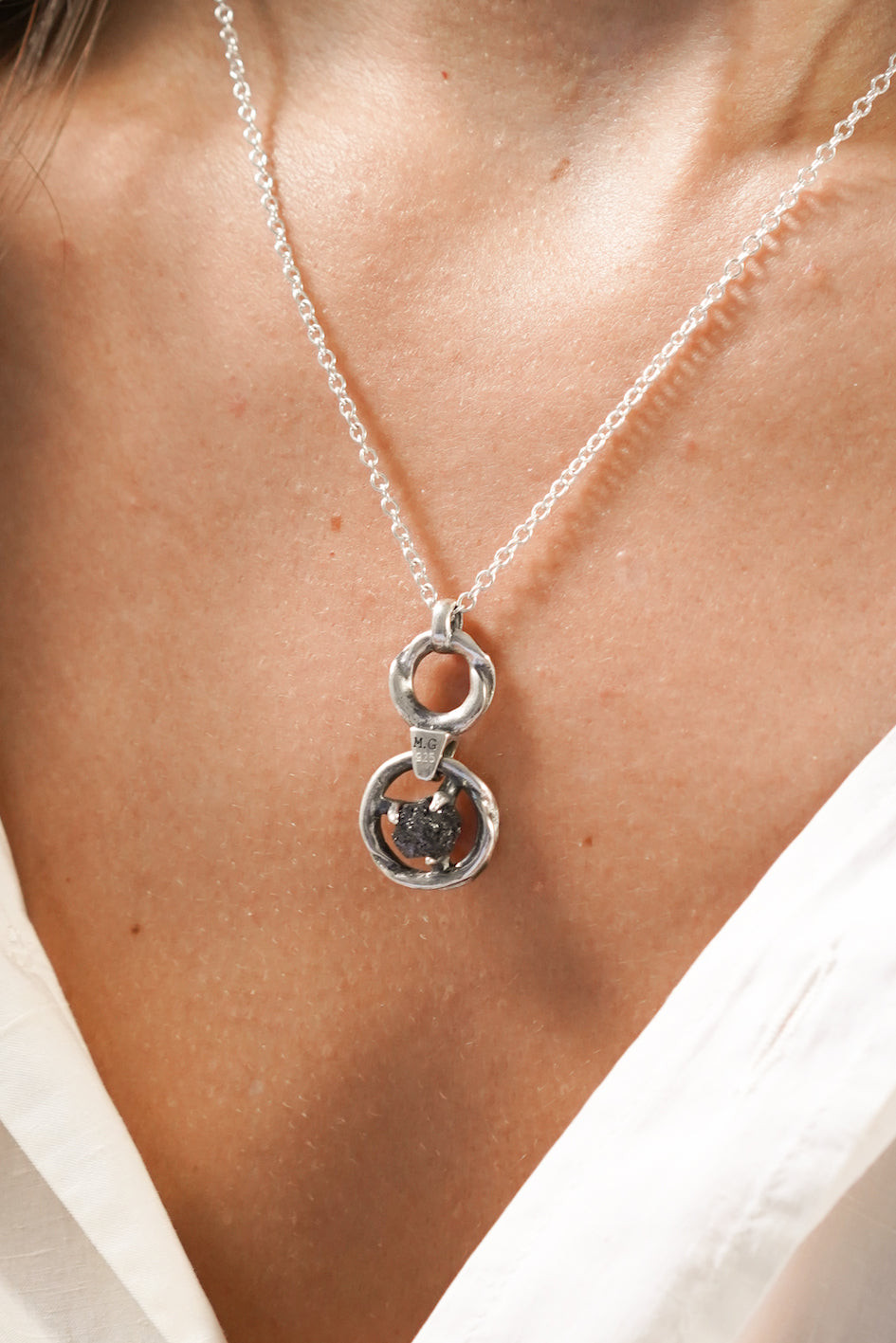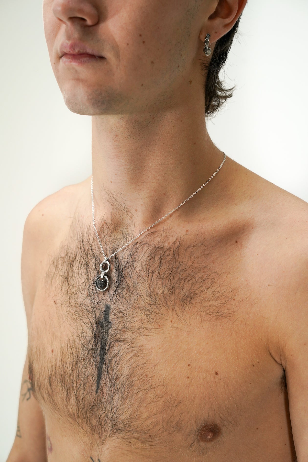 Maison Geneviève imagine des bijoux aux inspirations martiales avec une touche d’impudence. Ce pendentif, façonné à la main en argent 925, représente deux anneaux accrochés ensemble avec un diamant brut en centre d’un des anneaux.