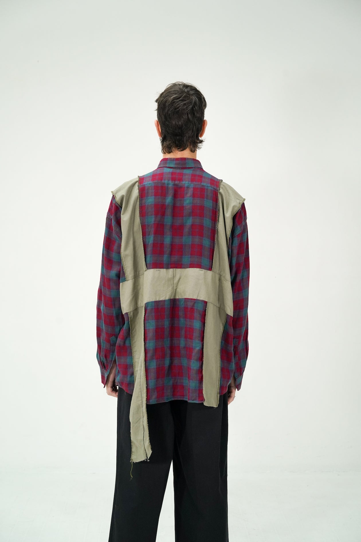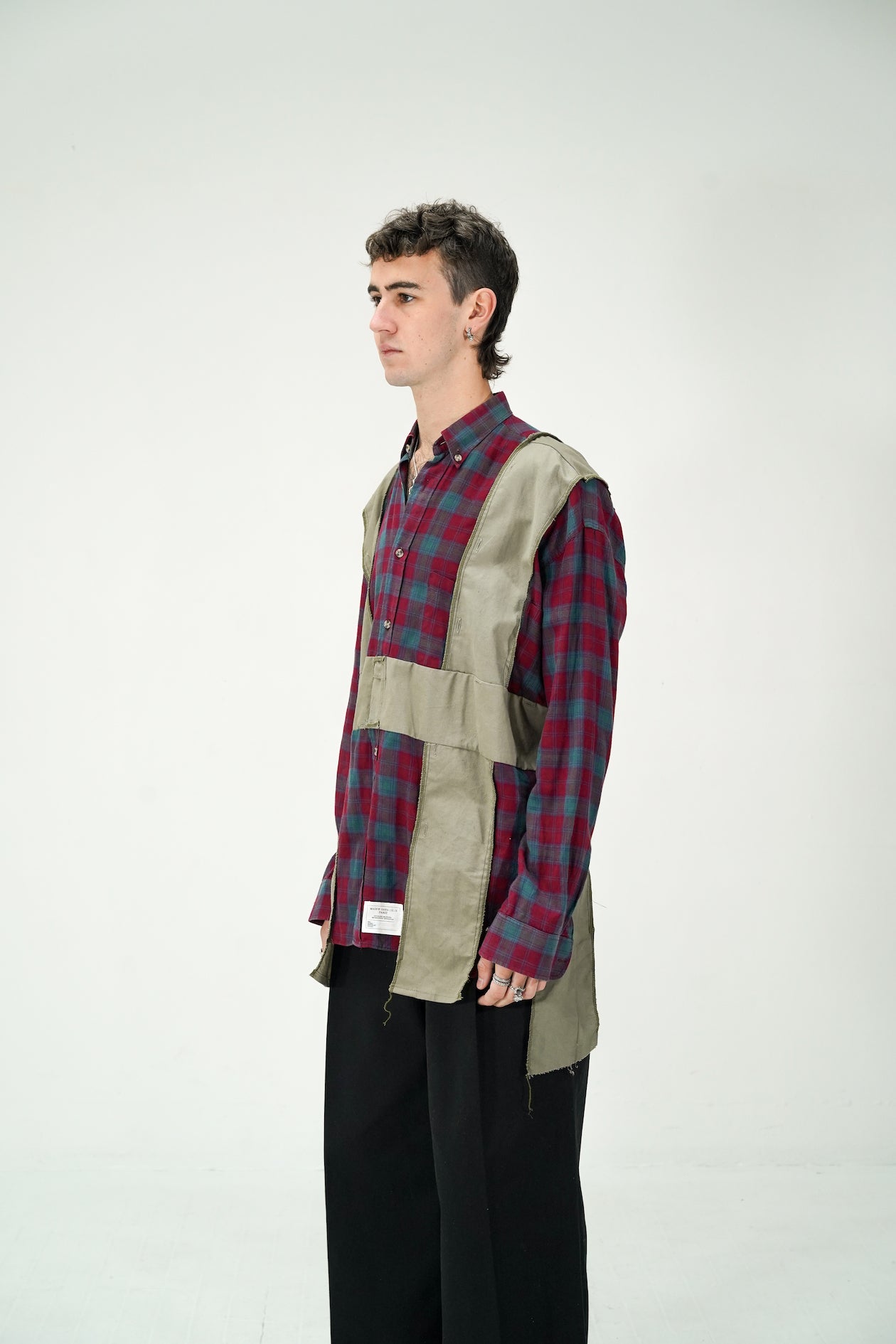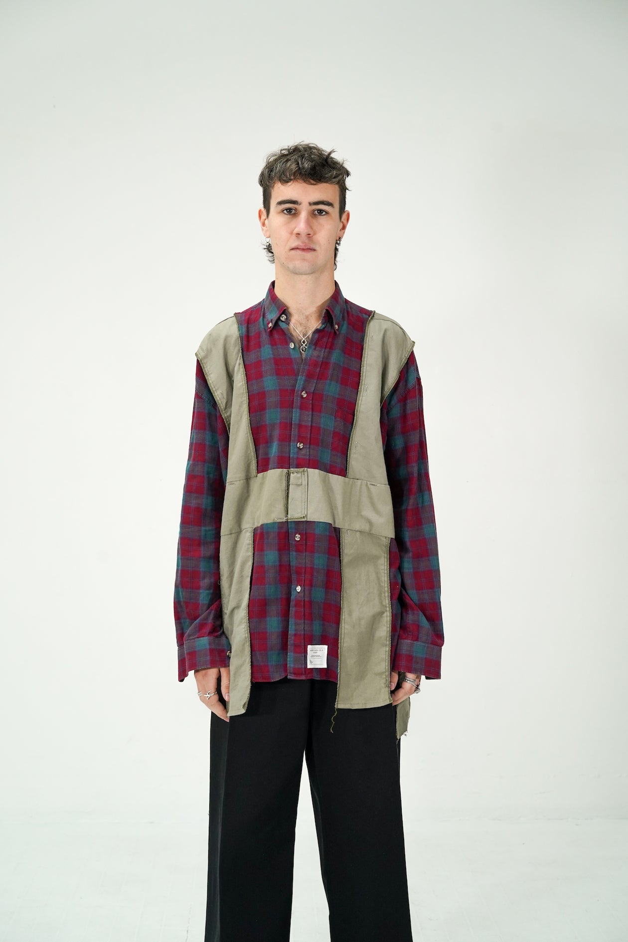 Cette surchemise propose une allure décontractée déstructurée en jouant avec des incrustations de bandes de différentes longueurs. Maison Geneviève utilise la bi-matière pour se réapproprier ses propres codes.
