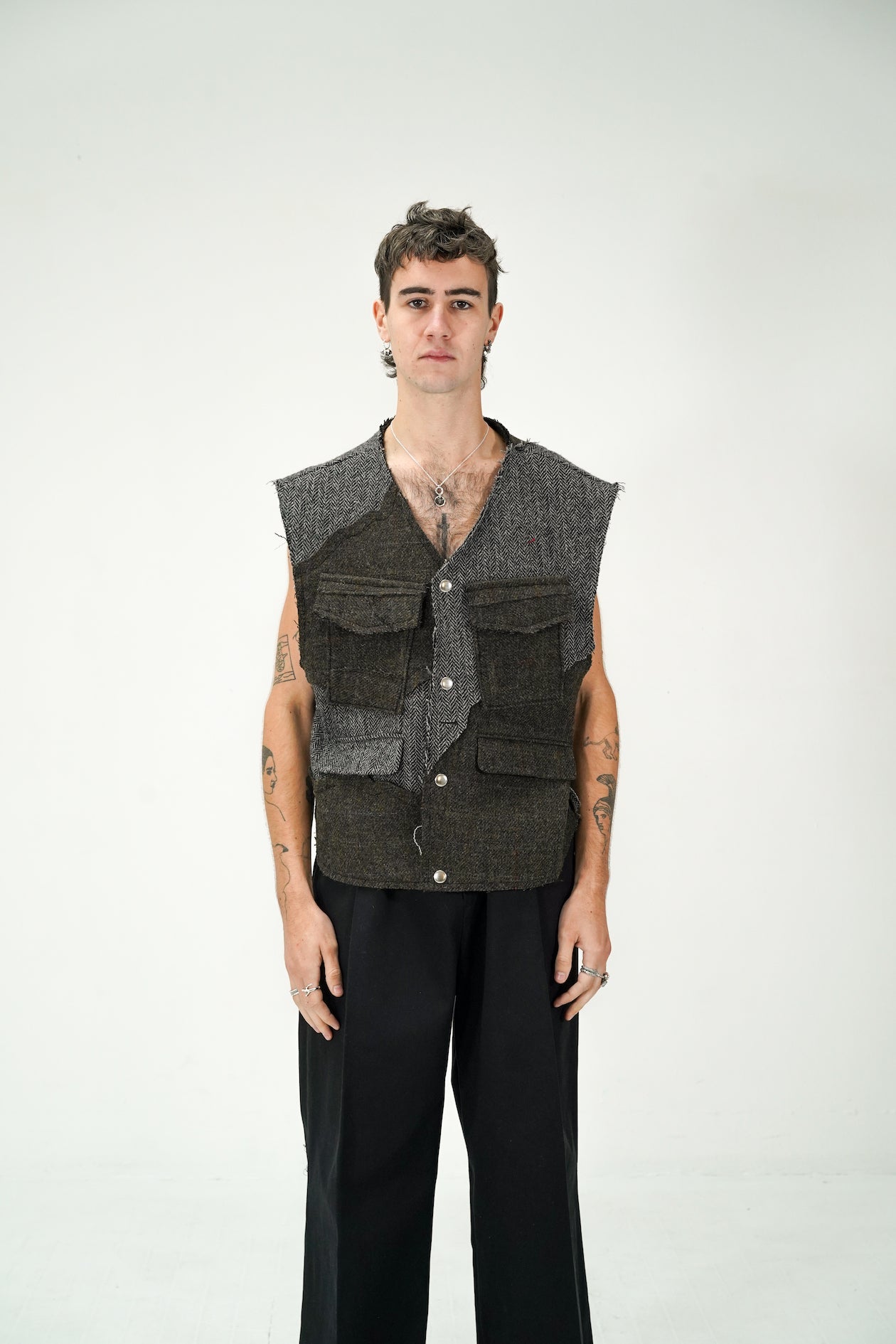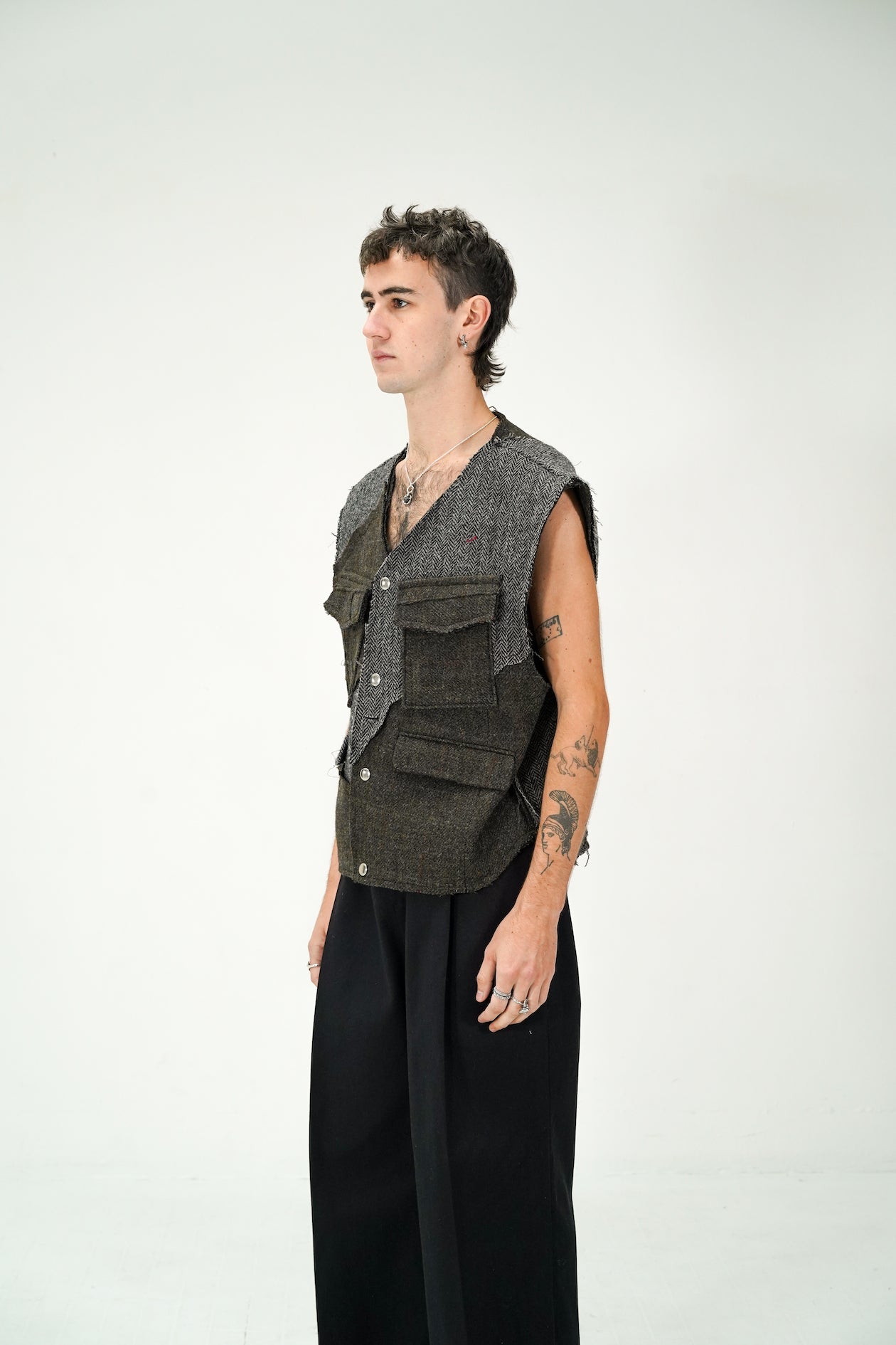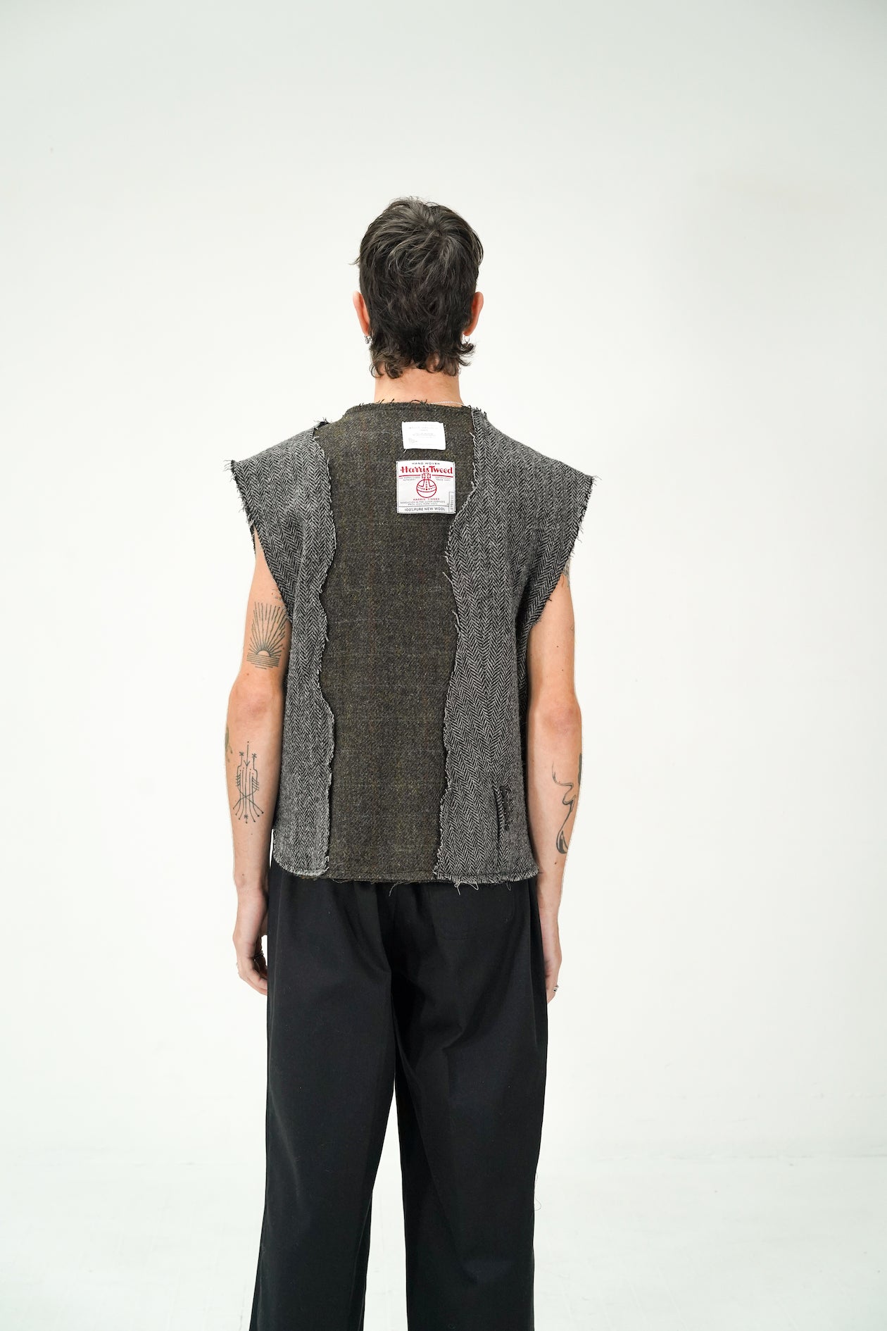 Maison Geneviève puise son inspiration pour ce gilet dans des vestes Harris Tweed vintage et dessine ce gilet casual aux finitions déstructurées.
