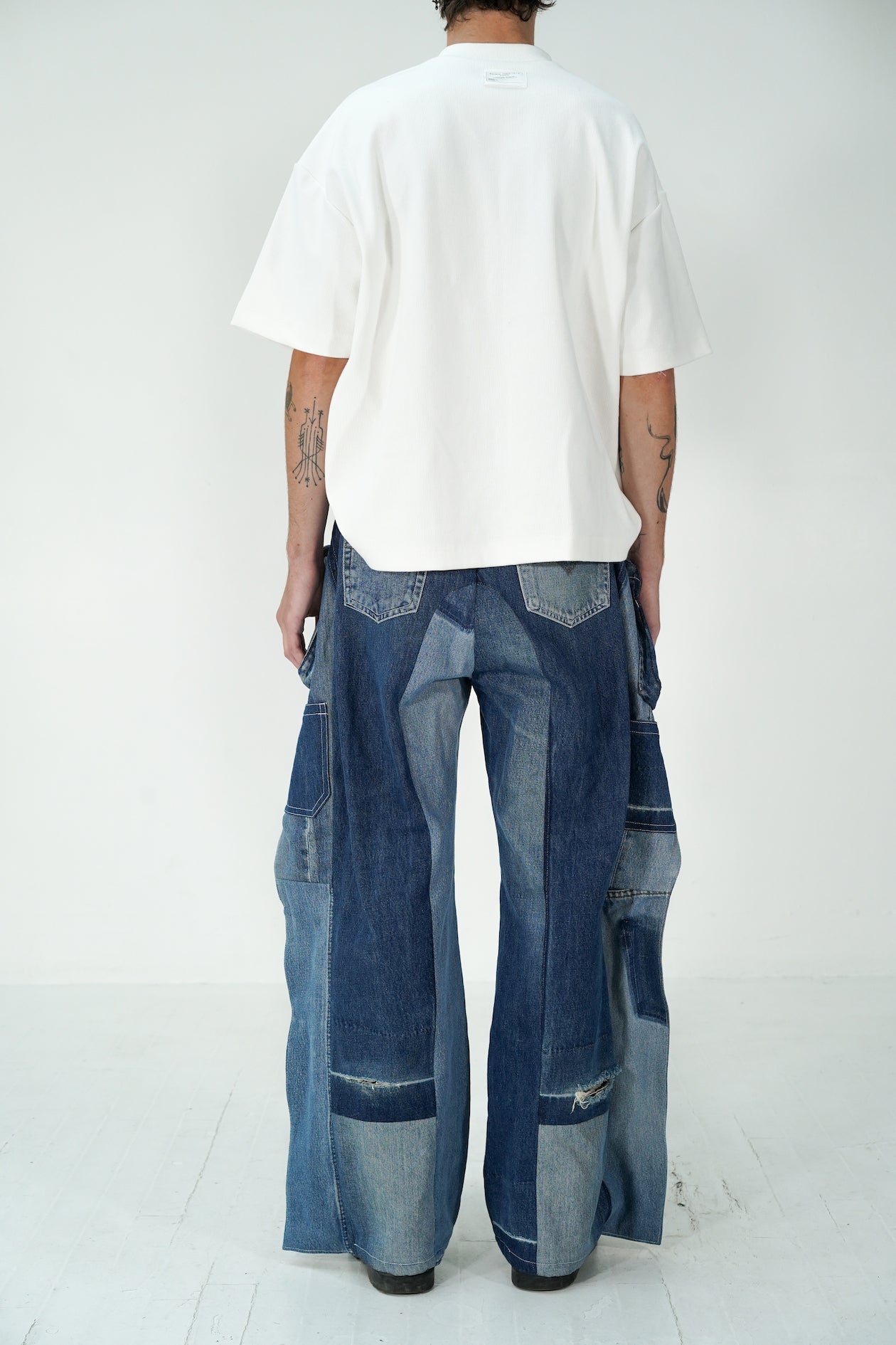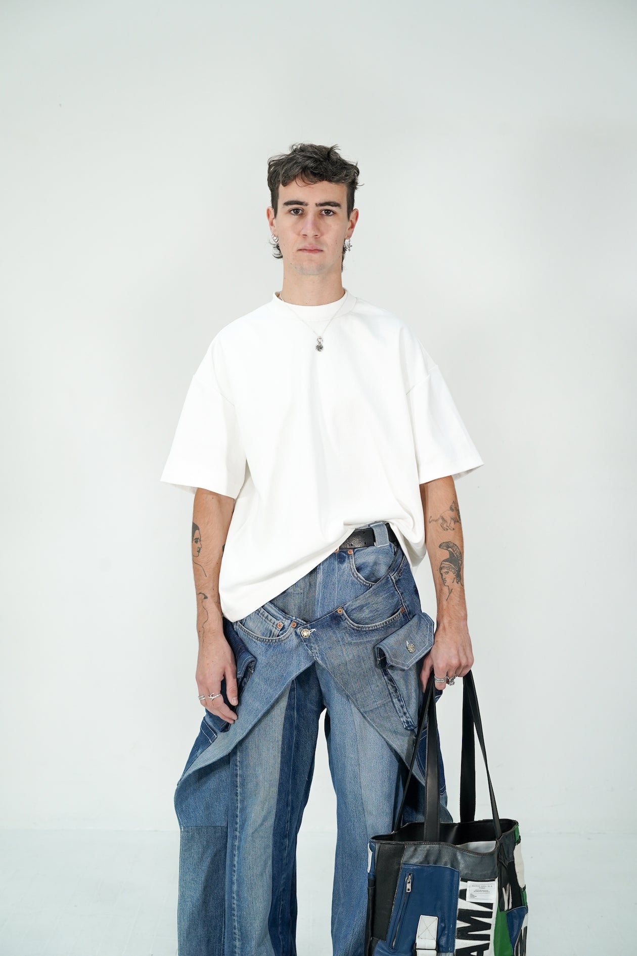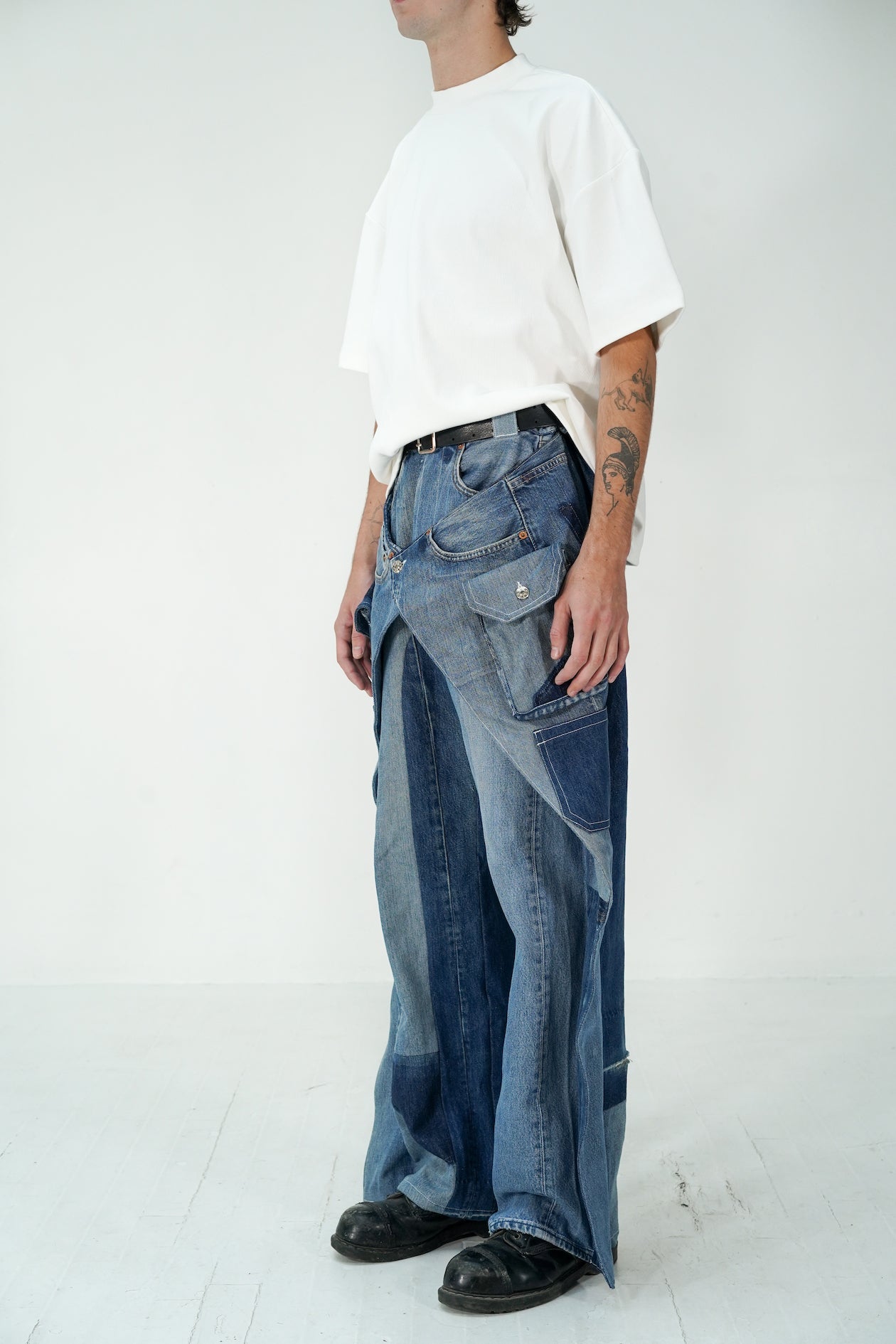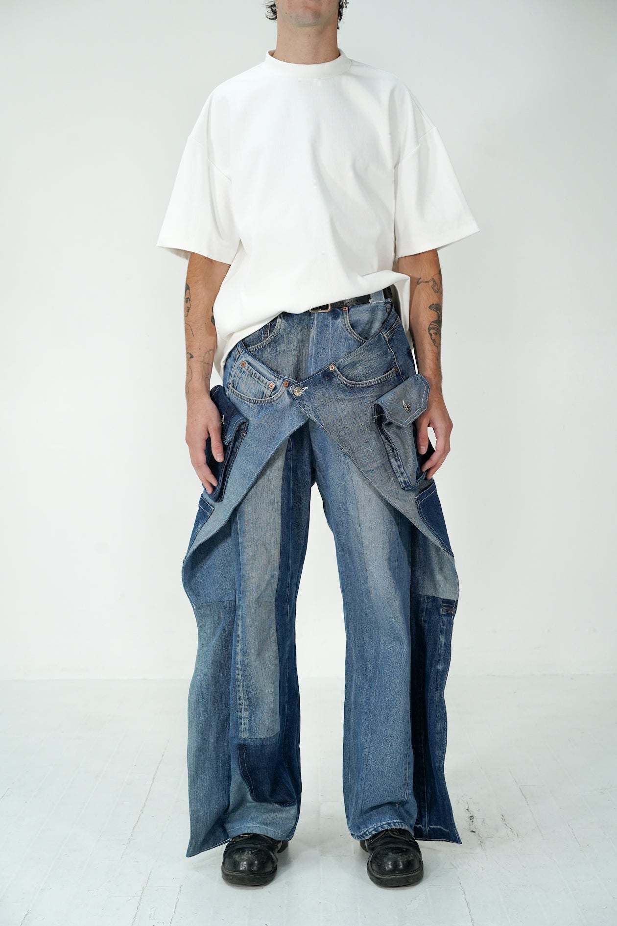 Jeans réalisé à partir d'anciens levis 501 aux délavages différents. Le devant arbore une seconde couche qui descend jusqu’aux chevilles avec quatre poches .